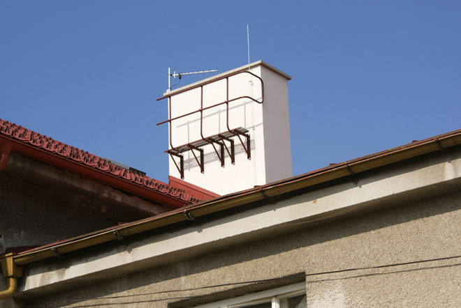 „Praxe je ale jiná, střecha bývá ve špatném stavu, nášlapy drží jen silou vůle a komínová lávka má stoupací část z prohnilého dřeva,“ směje se Zdeněk Štofaňak, který sám i revize provádí, a dodává: „To už by dnes normám samozřejmě nevyhovělo. Část, na které se stojí, by měla být protiskluzová, což znamená kovová s výstupky a otvory, které brání shromažďování vody a sněhu. I když kominík chodí po střechách každý den, jsou střechy, kam by se ani neměl pouštět – přece jen je to člověk a ne veverka.“