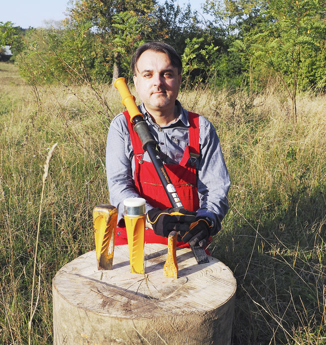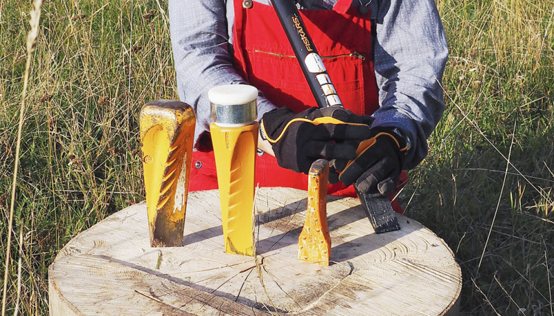 K testu jsem použil bukové špalky o průměru přes 50 cm, které bylo těžké rozštípat i kalačem. Pro tuto práci je velmi důležitý nástroj, kterým klín zatloukáte. Rozhodně by to neměla být sekyra, tu zpravidla zničíte, ale spolehlivá palice. Já jsem použil jednoruční bourací kladivo, rovněž od Fiskarsu.