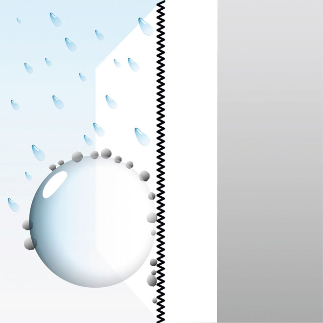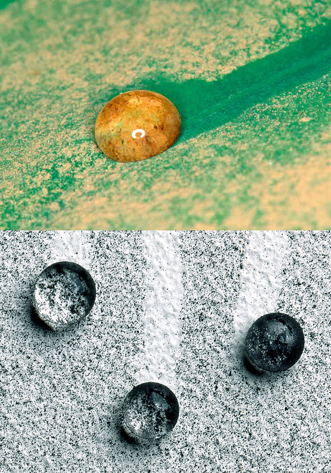 Fasádní omítky a barvy s lotosovým efektem se vyznačují extrémně nízkou smáčivostí povrchu, což způsobuje, že povrchy jsou sušší a tím i lépe chráněné proti růstu řas a plísní. Speciální mikrostruktura povrchu zajišťuje, podobně jako u lotosového listu, že nečistoty, které se na povrchu usadí, jsou vodou odnášeny pryč. Díky této mikrostruktuře zůstane vodní kapka, která dopadne na povrch, ve tvaru kuličky (kontaktní úhel je cca 140°). U klasických fasádních barev naproti tomu dochází ke smáčení povrchu – kapka se tzv. rozprostře po povrchu (kontaktní úhel je < 90°).