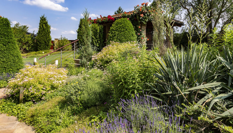 Představu malebné exotické zahrady v jižním stylu koncipovalo více zahradníků, ale výsledný tvar a celkové vyznění kompozice si známý hudebník vždy pečlivě hlídal. „Při tvorbě této zahrady jsem se maximálně snažila respektovat přirozenou modelaci terénu a zahradu navrhla tak, aby byla zasazena do tuzemských klimatických a půdních podmínek a byla s nimi plně v souladu, i když evokuje italské Toskánsko,“ upřesňuje Martina Hájková, která před lety vypracovala a realizovala návrh zahrady u vznikající rezidence Michala Davida.