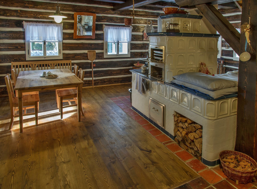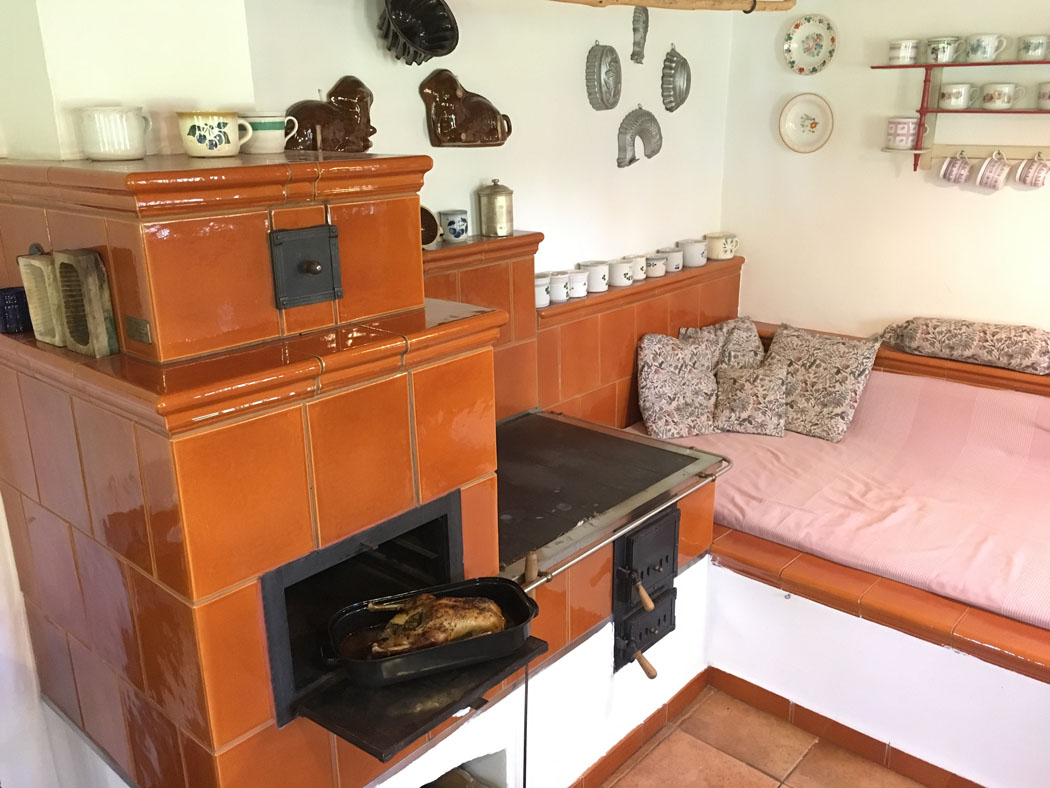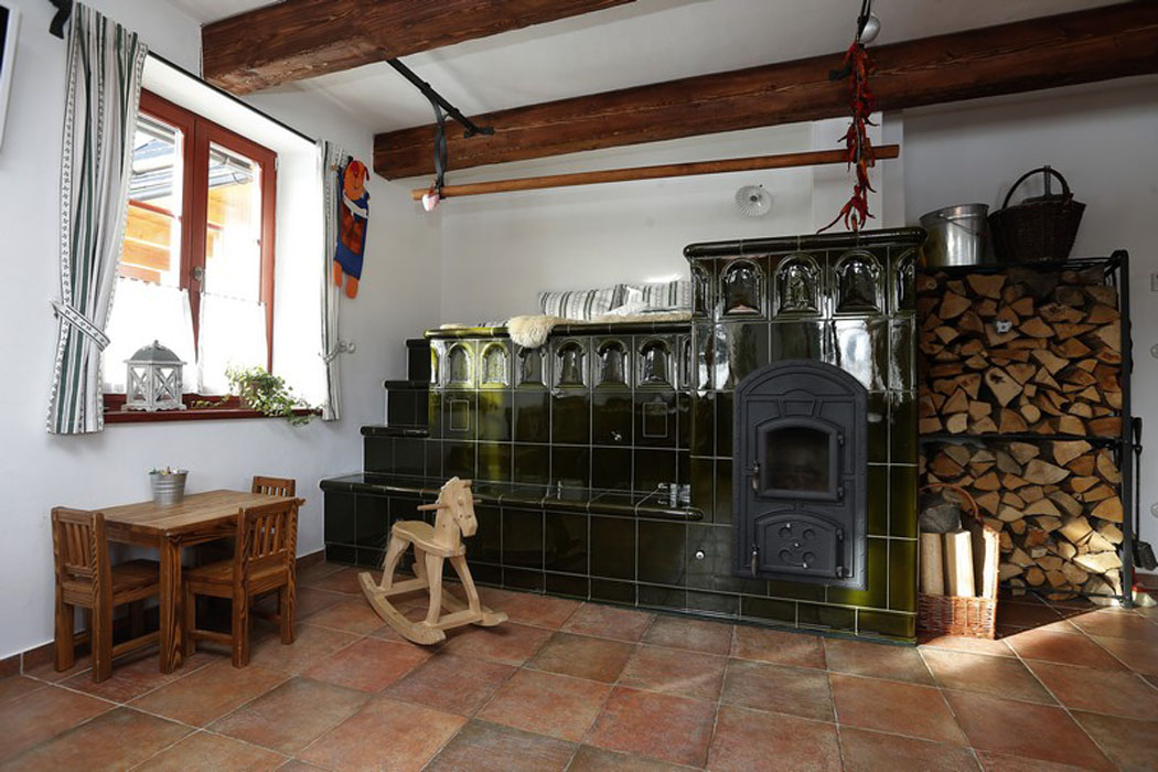 K dispozici: plně funkční kachlová kamna s vytápěnou pecí, finská sauna