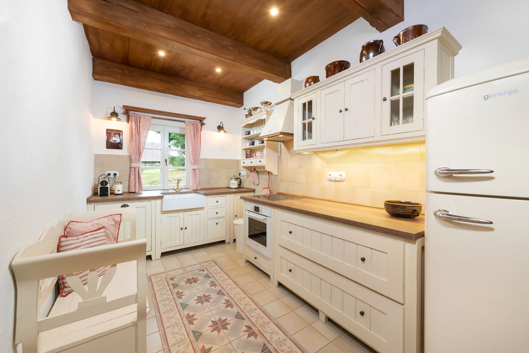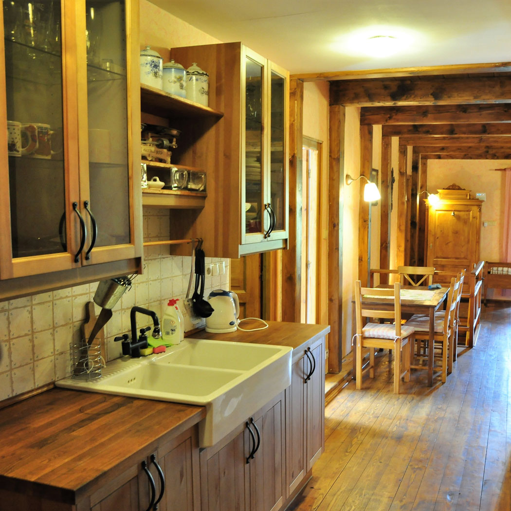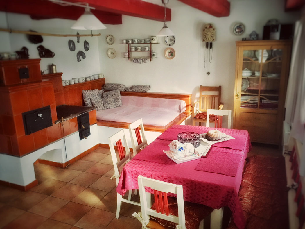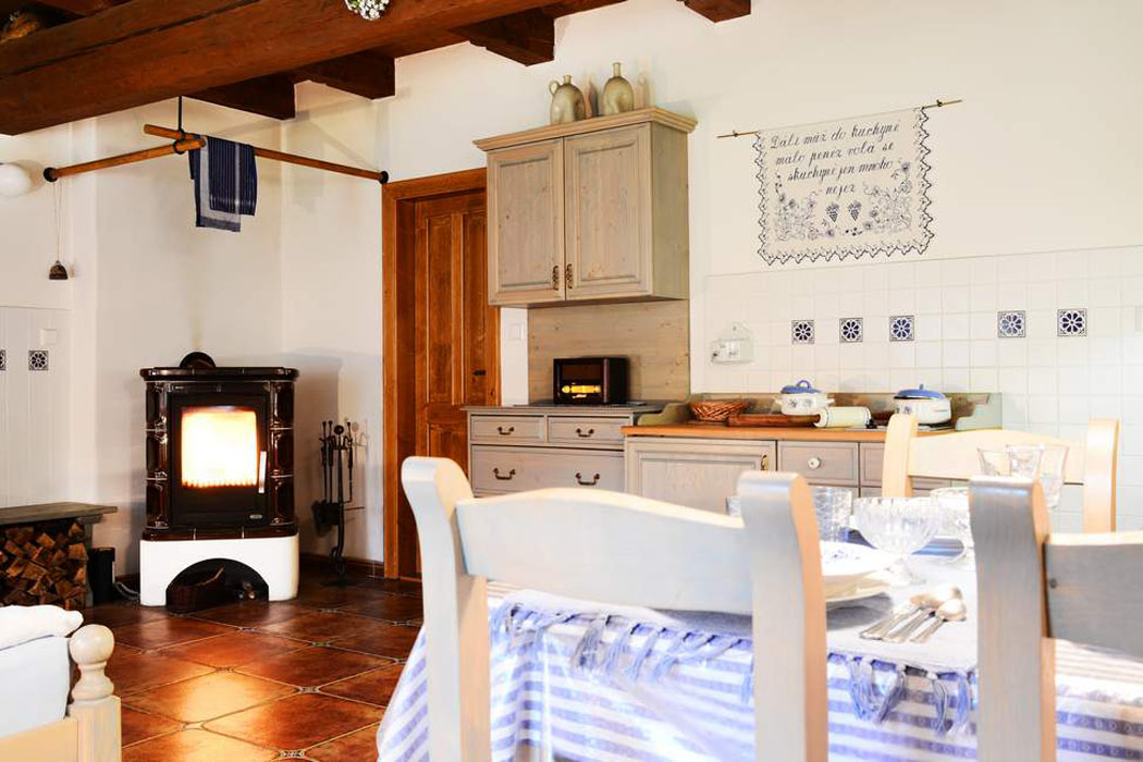 K dispozici: sednice s kachlovými kamny, plně vybavená kuchyň, koupelna s 2x WC, dětské hřiště