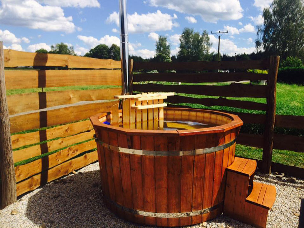 K dispozici: dřevěný koupací sud, ohniště, pískoviště, trampolína, prolézka, hračky, houpací síť, přenosný gril, badminton