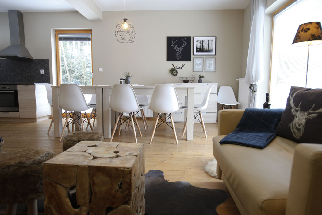 Klid a přírodu, která ještě nebyla zasažena davy turistů, najdete ve Žďárských vrších na Vysočině. Majitelé Jelínkovi zde postavili moderní chalupu, která ale dokonale zapadá do koloritu vesnice. Třeba i proto, že nábytek na míru vyrobil truhlář z Vysočiny, místní kovář pak vytvořil všechny kovové detaily. Zajímavým detailem interiéru jsou kafemlýnky, které zdobí parapety oken a poličky, ale také na míru vyrobená stínítka lampiček, která barevně ladí s barvou konkrétního pokoje.
