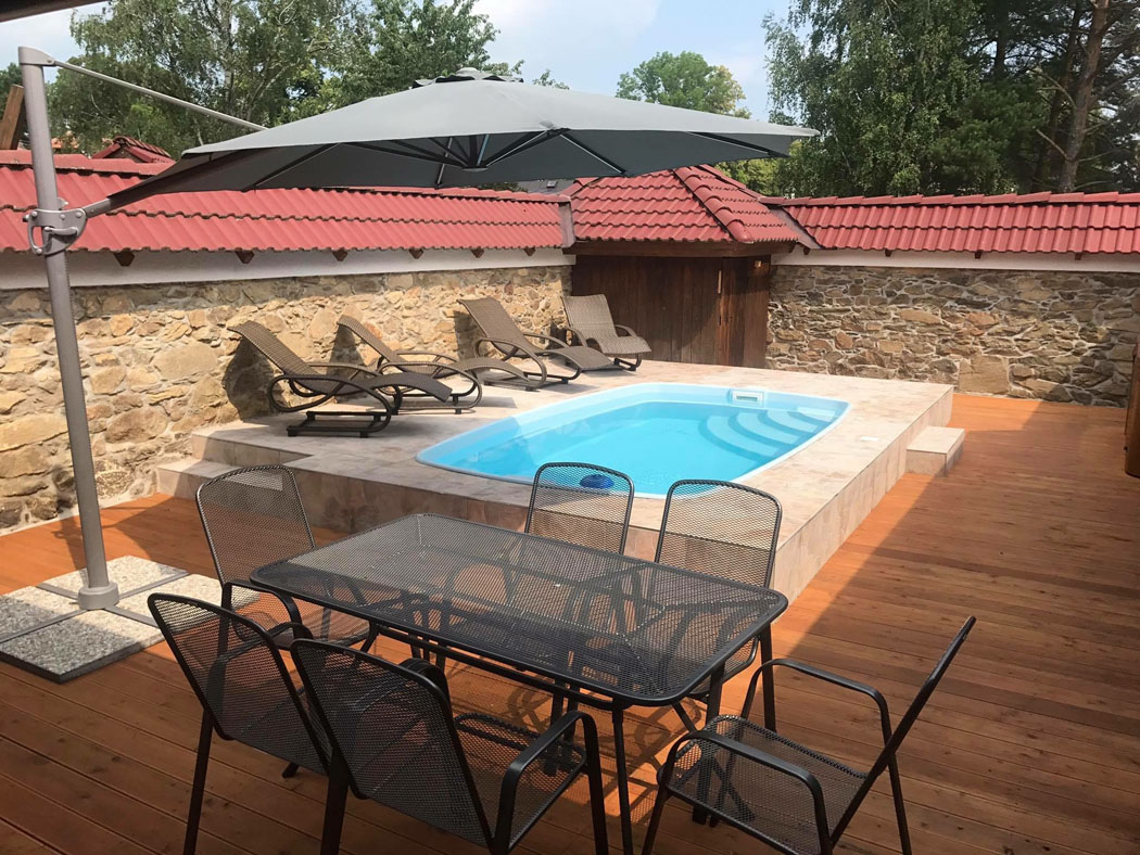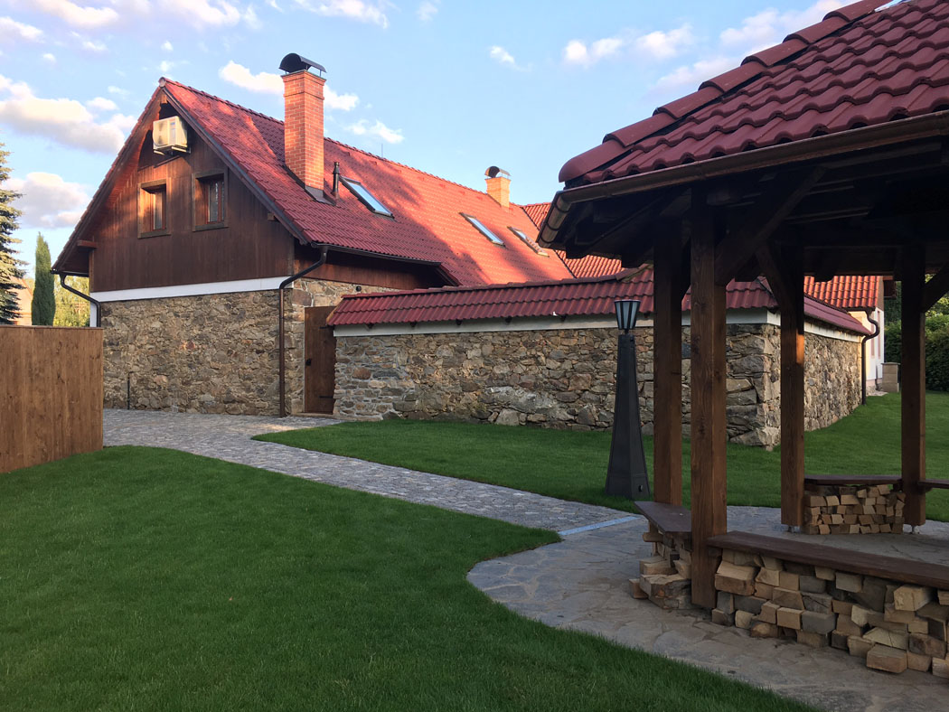 K dispozici: terasa s bazénem a vířivkou, ohniště pergola s krbem a udírnou, dětské hřiště s trampolínou, sportovní hřiště s umělou trávou, vybavení na venkovní hry aj.