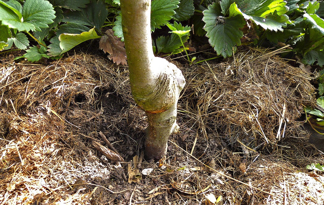 Stromek vložte do jámy tak, aby místo štěpování zůstalo ve výšce 5–10 cm nad zemí. Tuto zásadu je nutné dodržet i u stromků s velmi krátkou podnoží. Jinak by za čas došlo ke „zpravokořenění“ – stromek by pustil kořeny i z naštěpované odrůdy nad podnoží, rostl by příliš rychle a málo by plodil. |