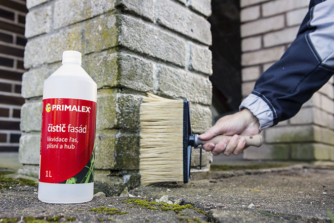 Nejprve proklepejte okolí trhliny a zjistěte, zda se pod omítkou nenacházejí dutiny. Vyzkoušejte savost podkladu namočením vodou – měla by se vsakovat pomalu a rovnoměrně. Pevnost omítky prověřte vrypem šroubováku do povrchové vrstvy. Poté fasádu omeťte a omyje vysokotlakým zařízením (wapkou) s příměsí fasádního čisticího prostředku E709. Trhliny menší než 0,2 mm (vlasové trhliny) přetřete nátěrem weber.ton micro V. Větší trhliny proškrábněte rohem špachtle do tvaru písmene V a vyplňte Extra stěrkovou omítkou M742. Po zatvrdnutí povrch přebruste brusným papírem a přetřete nátěrem weber.ton micro V. Pozor – většina fasádních nátěrů nesnese teplotu nižší než 10 °C a vyšší než 30 až 35 °C.