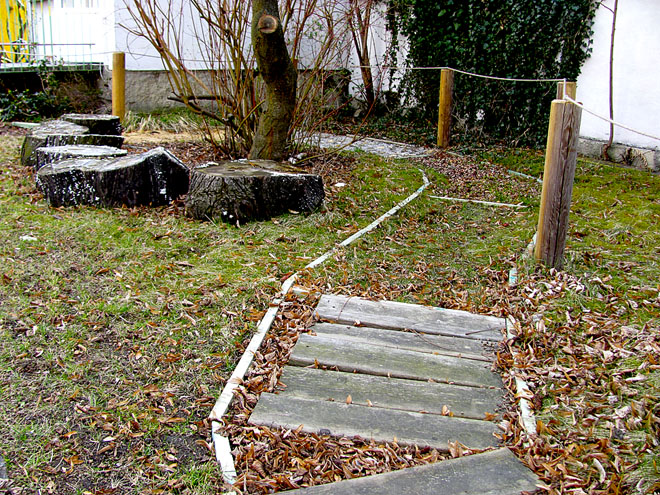 Spáry chodníčků kolem domu nevyplňujte cementovou maltou – sice se nevyplavuje a neprorůstá, ale také nepropouští vodu a může odvést vlhkost do přilehlého zdiva.
