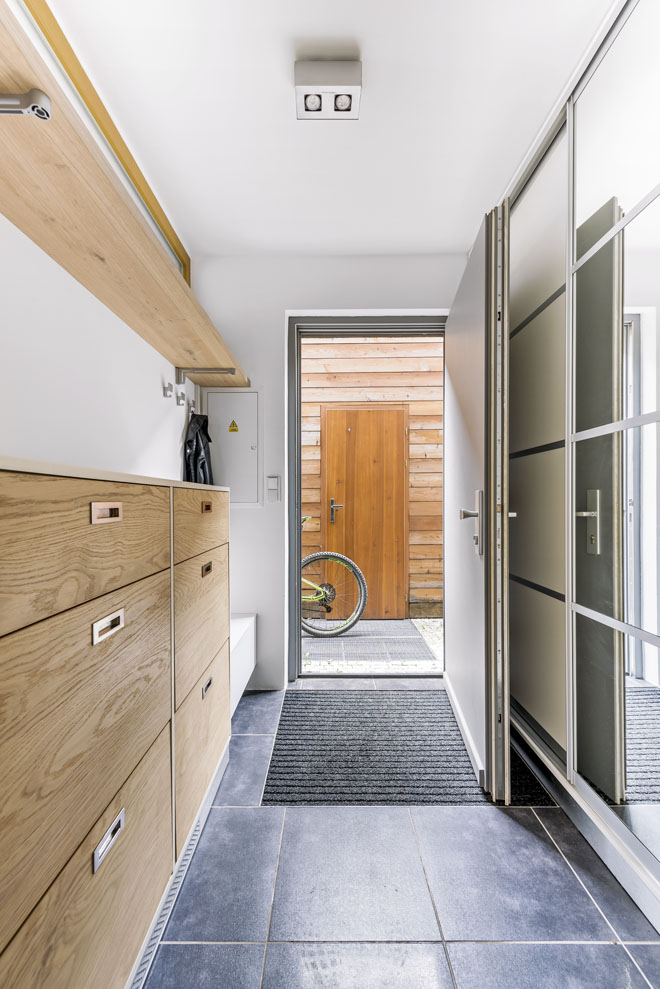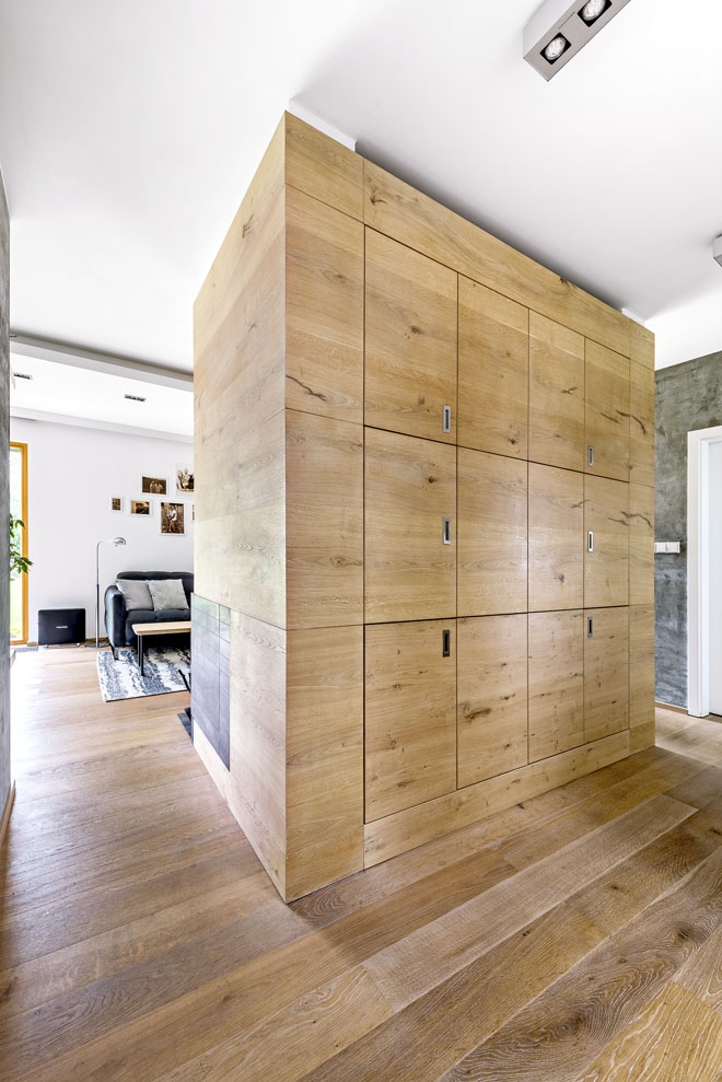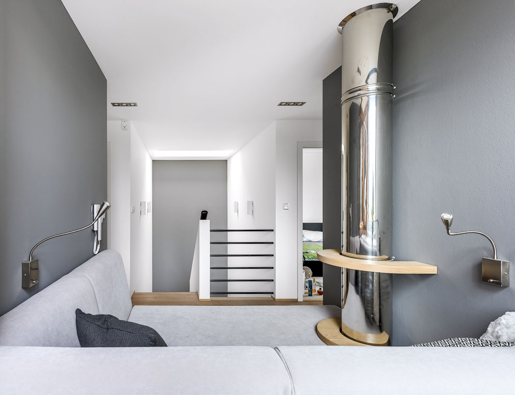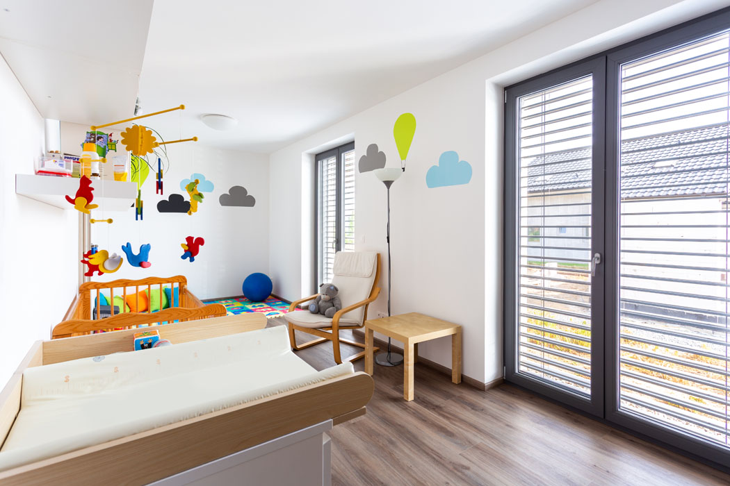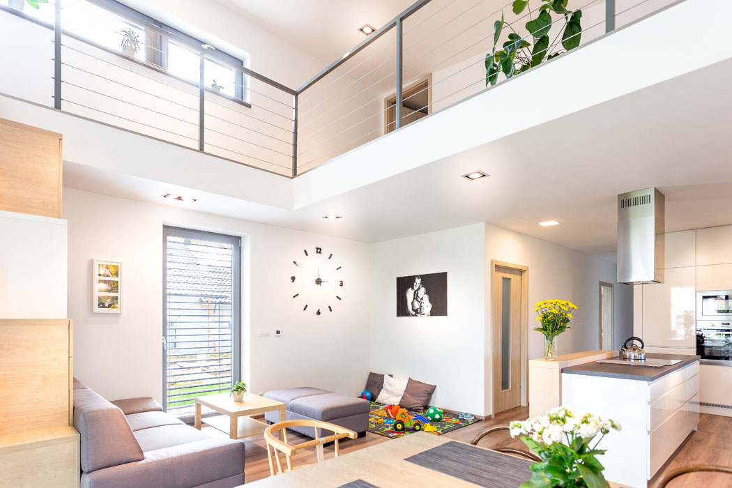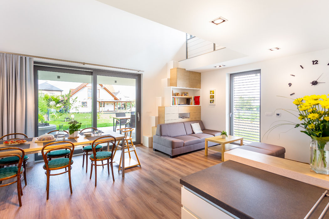 Vzniklé hliněné příčky jsou nejen nadstandardně akumulační a zvukově izolační, ale také ideálně regulují vlhkost v místnosti a vytvářejí tak vhodné mikroklima. To byl tedy další důvod k použití stavebního materiálu HELUZ v tomto případě na příčky všech dlouhodobě obývaných místností, tj. obývacího pokoje, ložnice a dětských pokojů. Jak nám řekl pan Petr, hledal stále nová a netradiční řešení, aby co nejefektivněji přispěl k nejlepším parametrům zdravého a při tom pasivního bydlení ve svém budoucím domě.