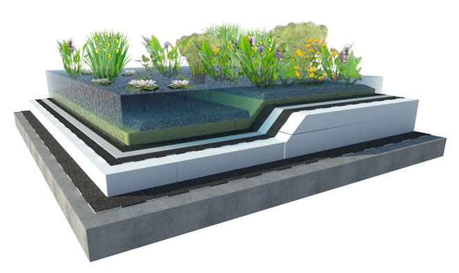 Střešní jezírko nebývá tak náročné a nákladné, jak by se na první pohled mohlo zdát. Své místo si v něm najdou vodní rostliny, které zakoření i v malém množství vodního substrátu a hydrofilní vaty.