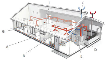 Její princip je velmi jednoduchý. Přiváděný venkovní vzduch proudí do rekuperační jednotky uvnitř vzduchotechnického systému, kde se ohřívá ve výměníku teplým odpadním vzduchem z jednotlivých místností. Čerstvý předehřátý vzduch je následně vháněn ventilátorem do interiéru a odpadní vzduch zbavený přebytečného tepla je odveden z budovy. Teplo obsažené v odpadním vzduchu se tak zároveň využívá k předehřevu vnitřního prostředí a snižuje množství energie, která je potřeba na vytápění.