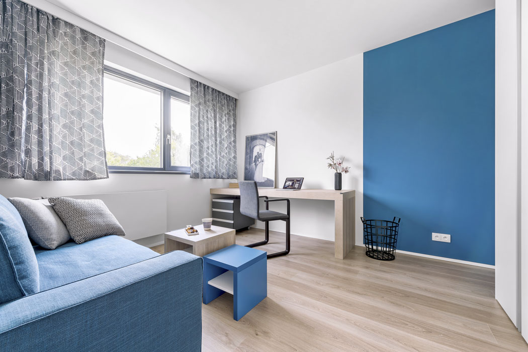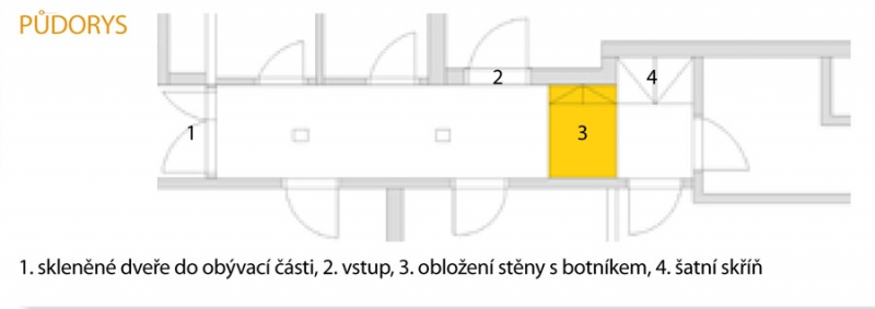 V návrhu nebyla žádná dostatečně velká volná stěna, a i kdyby se sem nějaká menší skříň umístila, poměrně úzký prostor by se ještě zúžil. K úložným účelům se nabídla na jednom konci předsíně oddělená chodbička, která měla zajistit intimitu prostoru mezi ložnicí a koupelnou manželského páru.