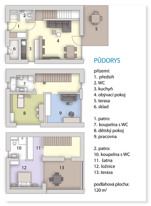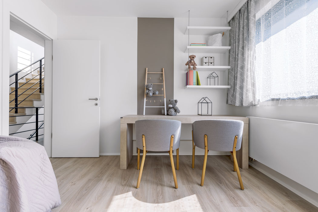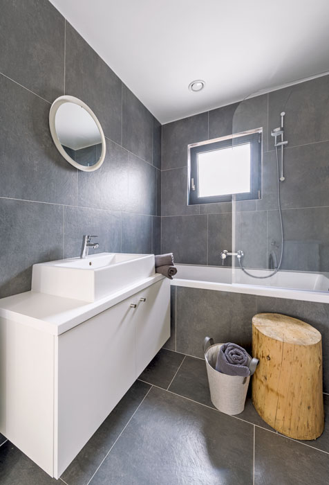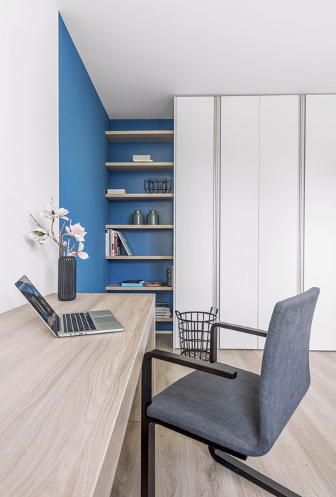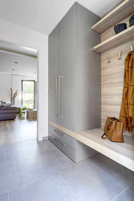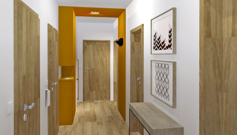 K optickému zkrácení a rozčlenění jsem v místě, kde proti sobě byly volné plochy bez dveří, nechala obložit část stěn a strop deskami, jejichž výraznější barva předsíň příjemně oživila. Na jedné straně tohoto obložení jsme si ještě mohli dovolit vestavět vysoký, 30 cm hluboký botník a naproti je nástěnný věšák. K prostorové členitosti přispěl i mělký stolek na subtilní konstrukci a praktická dřevěná stolička.
