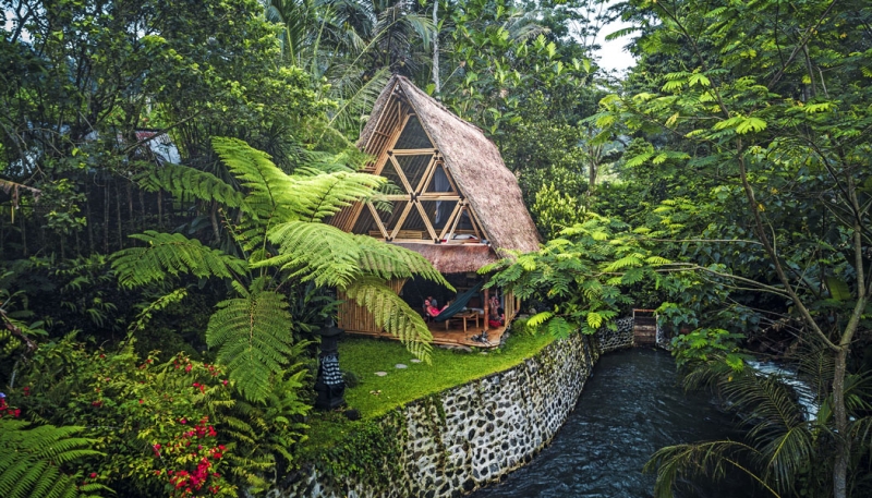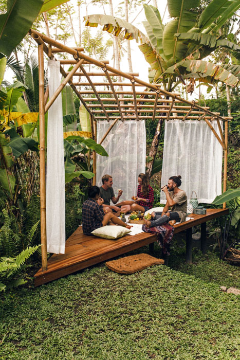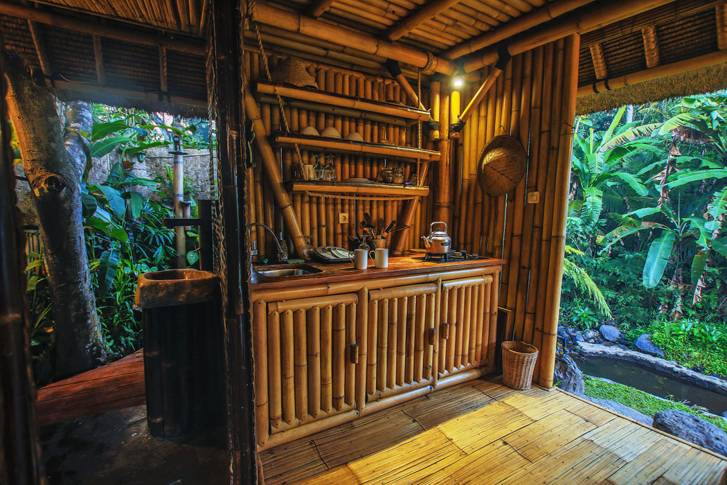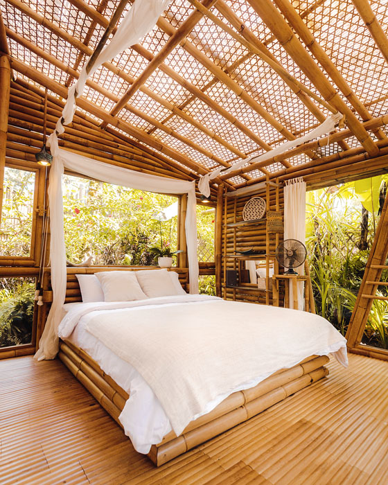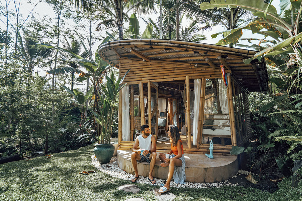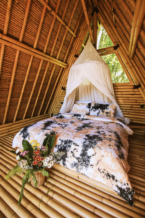 Bambus je jedním z nejekologičtějších stavebních materiálů na světě. Ačkoliv patří do čeledi trávy, dokáže vyrůst do výšky až dvacet metrů, má až dvaceticentimetrový průřez. Je extrémně odolný, ale zároveň velmi pružný. Má úžasnou akustiku a přirozeně vyrovnává teplotu v místnosti. Hned od začátku jsme byli bambusem fascinováni. Dříve na Bali nebyly jiné než bambusové domky, až s příchodem moderní doby je vystřídaly cement a betonové cihly. Domek z bambusu se tak nově stal luxusem a nezvyklým zážitkem, přece jen, je to trochu dobrodružství spát v domečku z trávy.