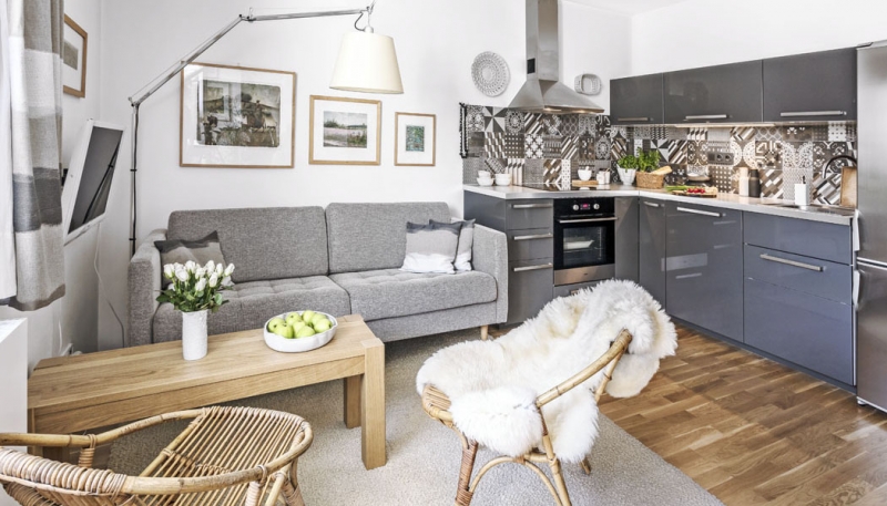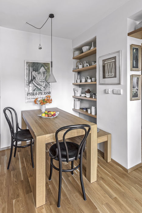 Rekonstrukci vzala paní Pavla s architektkami doslova od podlahy včetně změny dispozice. Z chodby se původně chodilo dveřmi do ložnice a druhými do pokoje s kuchyní. Pavla byla ale z Vinohrad zvyklá na velký otevřený prostor, a tak se rozhodla si ho ve zmenšené podobě dopřát i tady.