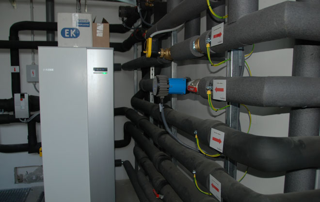 Celý komplex je zónově vytápěný a chlazený prostřednictvím systému, jehož součástí je tepelné čerpadlo systému země-voda NIBE F1345 o výkonu 40 kW, tři retenční nádrže s plošnými kolektory a soustava čtyř hlubinných jímacích vrtů. Retenční nádrže se nachází pod vsakovací galerií dešťové vody, do které je odváděna voda z areálu, a slouží k ukládání tepla při výrobě chladu v letních měsících. Jímací vrty o délce 4 x 137 metrů jsou určené k získávání energie ze země.