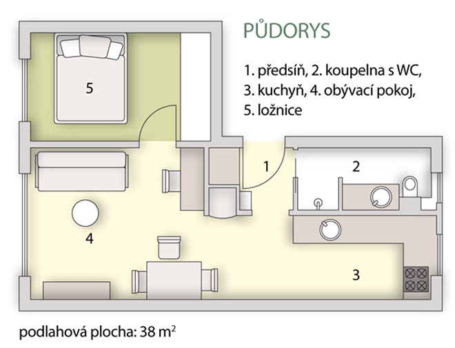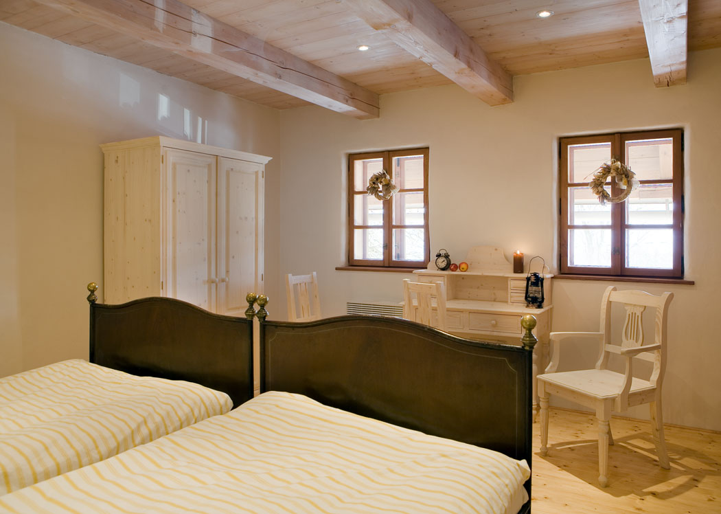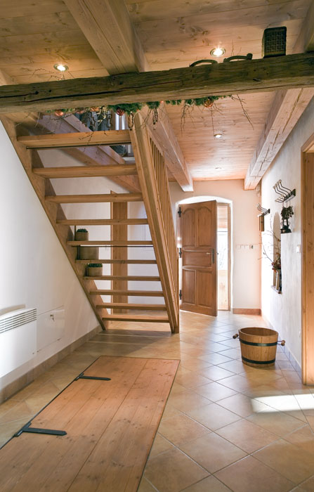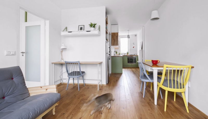 Původní dispozice 2 + kk byla téměř zachována, ale došlo k vyzdění nových příček mezi koupelnou a kuchyňským koutem a ke zvětšení koupelny na úkor kuchyně, což je téměř nepatrné, ale pro jednotlivé místnosti výhodné. Jako sjednocující prvek byla zvolena podlaha, kterou v předsíni a koupelně tvoří cementová dlažba, v ostatních prostorách je položena masivní dubová podlaha.