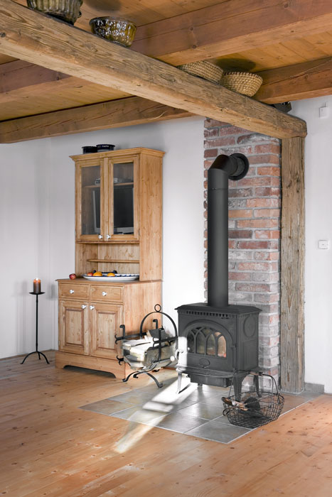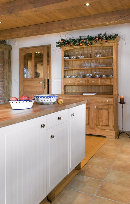 Majitelé rádi vaří, proto byla velká pozornost věnována kuchyni, aby splňovala nejen estetické, ale i funkční kvality. Kuchyňská sestava je situovaná do tvaru písmene L a vede pod okno, kde byla původně spíž. Vzniklo tak příjemné místo na vaření u okna, ale bylo potřeba vyřešit náhradní úložný prostor. Kuchyňská stěna je proto využita po celé výšce.