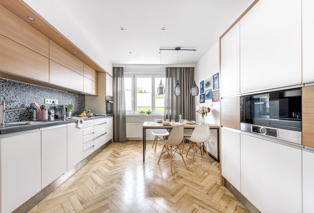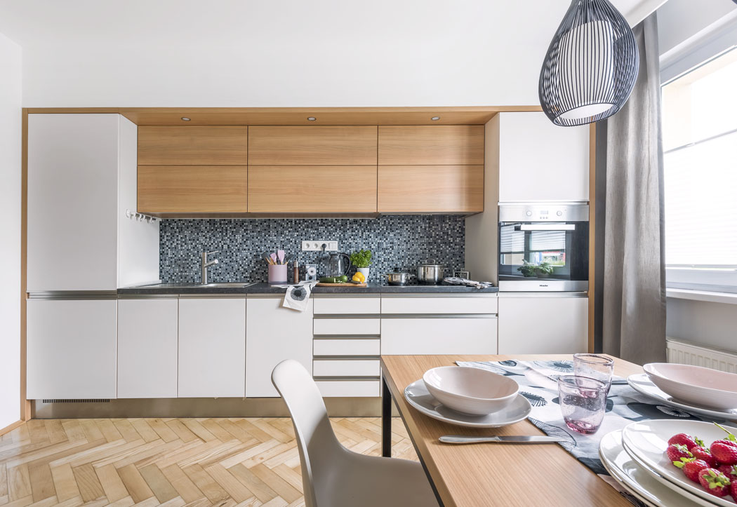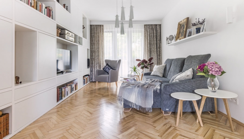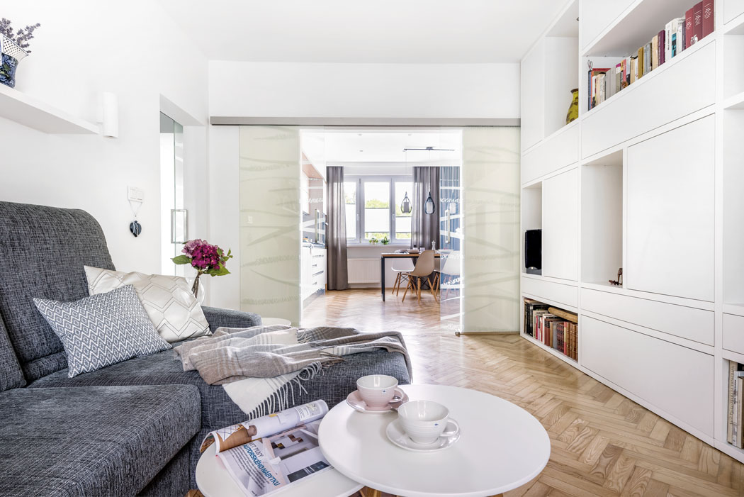 Zadání znělo vytvořit světlý a moderní interiér. Byt je ve zvýšeném přízemí a kolem jsou vzrostlé stromy, takže světla uvnitř moc není. S tím souviselo probourání zdi mezi obývákem a novou kuchyní s jídelnou.Větší část zdi nahradily skleněné posuvné dveře. Tím se do obou místností dostalo více světla a dveře vnesly do interiéru zajímavý prvek. V obývacím pokoji designérka na celou boční stěnu navrhla soustavu polic a úložných skříněk s dotykovým otevíráním. Na zakázku ji pak do technických detailů domyslel a zhotovil truhlář Marian Pácalt.