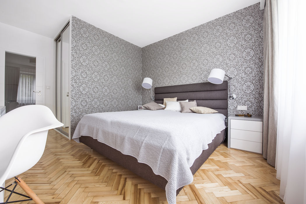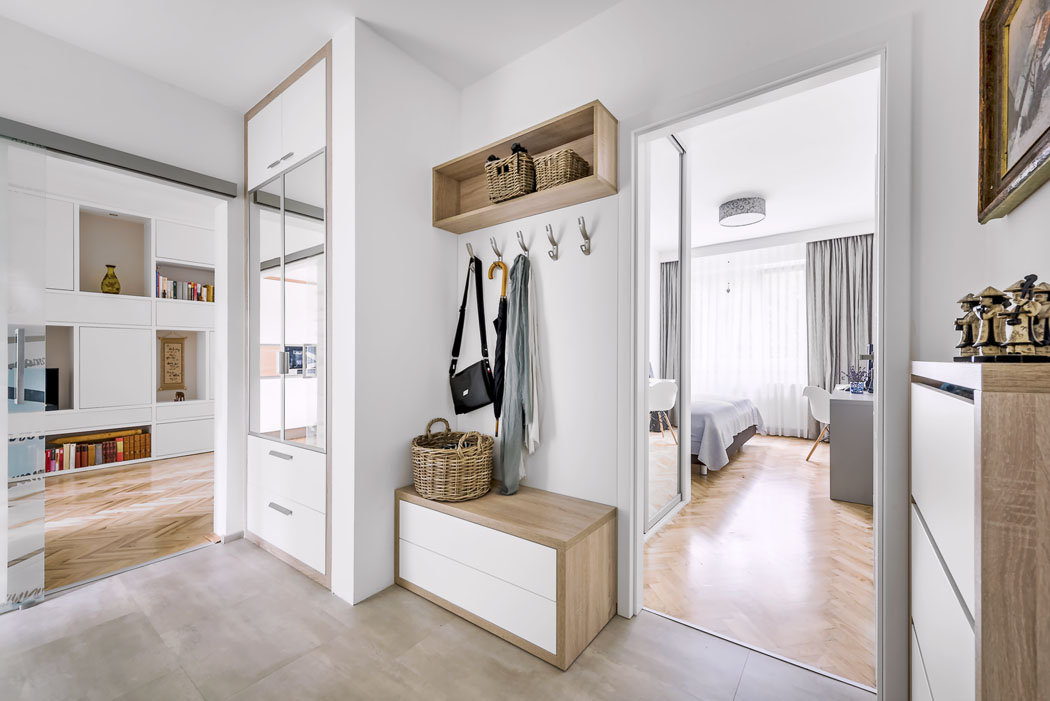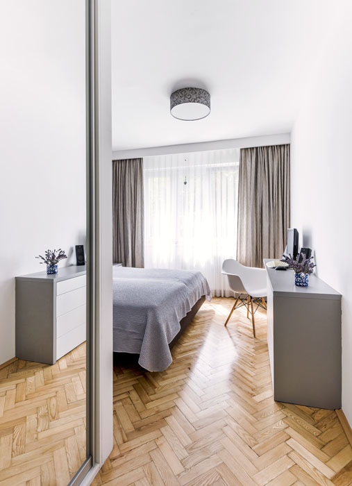 Dětský pokoj se mohl přeměnit na ložnici, do níž designérka místo skříní nechala vyzdít poměrně velkou šatnu. Design místnosti tak zůstal čistší a vešlo se tam i dvojlůžko, noční stolky a pracovní koutek. Velmi se provzdušnila předsíň, která má nově oproti původním požadavkům mnohem méně úložných prostor.