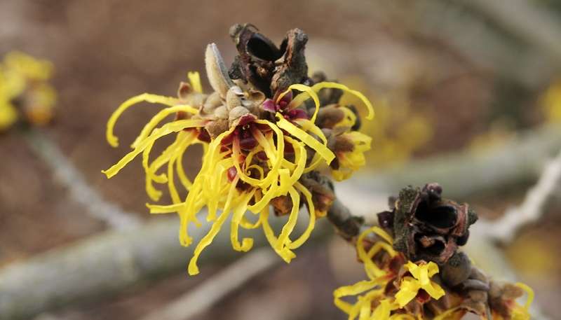 Z dřevin kvete velmi zajímavý, poléhavě až převisle rostoucí chabý keř jasmín nahokvětý (Jasminum nudiflorum). Jeho prutovité větve dorůstají délky do dvou metrů. Kvete od prosince přibližně do konce března, snáší i nejnižší teploty, ale v době silných mrazů kvetení na čas ustává. V únoru rozkvétají i další keře, například kalina Farrerova (Viburnum farreri) ze severu Číny potěší příjemně vonnými květy, vilíny (Hamamelis) zase červenými a žlutými chomáčky květů. Bohužel pro alergiky začíná kvést i líska.