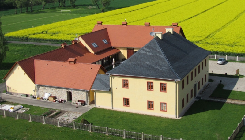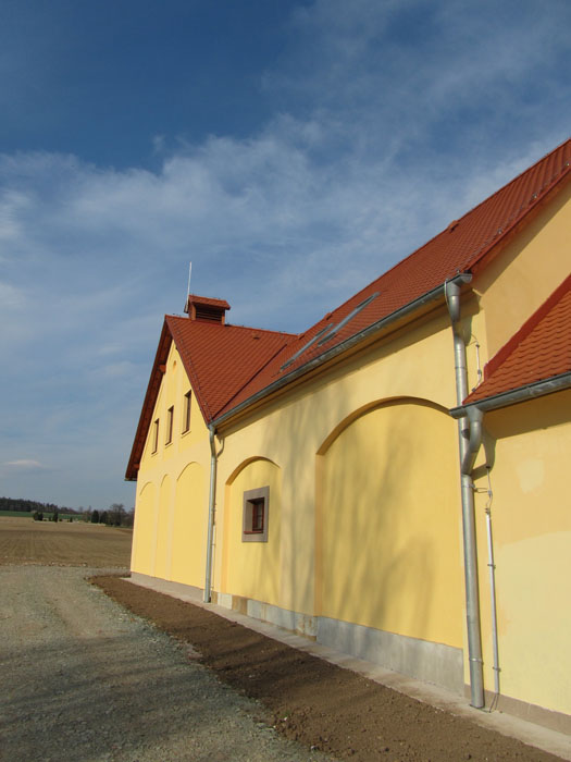 Také u hospodářských budov požadovali památkáři dodržet původní zastřešení, v tomto případě šlo o keramickou, pálenou krytinou typu „bobrovka“. Jako nejvhodnější model byla vybrána bobrovka z produkce firmy Bramac: Opál v režné úpravě. Tento model je v souladu s požadavky památkářů, a proto je hojně využíván pro rekonstrukce střech památkově chráněných objektů.