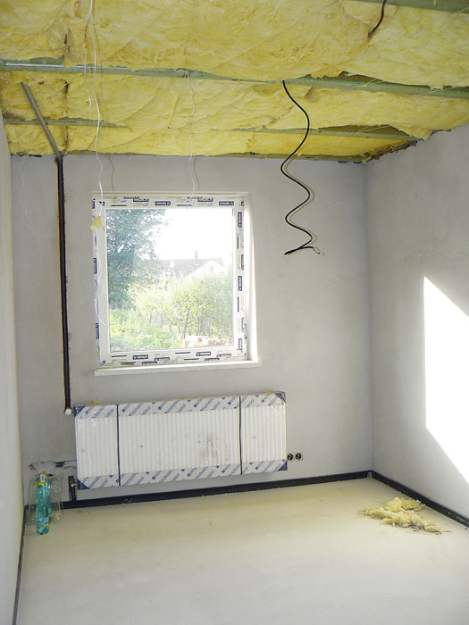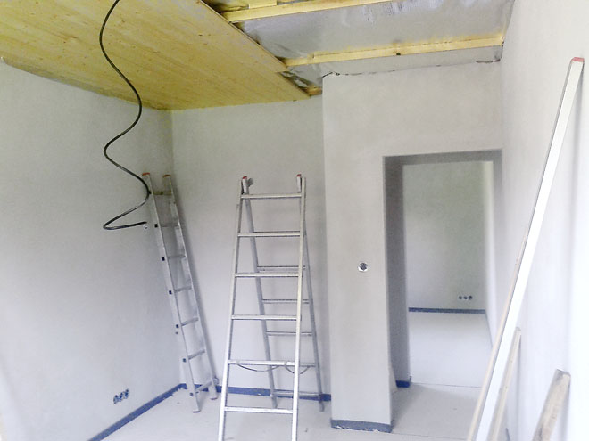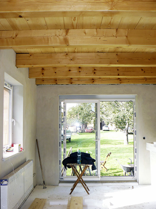 Když jsme zvažovali, jaké udělat v domě stropy, nabízely se dvě varianty. Betonové nebo dřevěné. Z praktického hlediska se manželovi více zamlouvala varianta dřevěných. Není třeba jeřáb na složení těžkých betonových dílců ani další mixy s betonem na zalití spojů, stropy se pak nemusí složitě omítat ani malovat. Já si přála dřevěné stropy od počátku. Pokud by bylo na mně, pořídila bych si roubenku, to však neprošlo už v prvotních úvahách, neboť se cena lehce vymykala našim finančním možnostem.