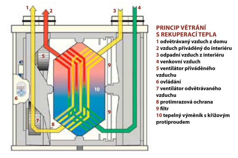 Tepelné ztráty se dělí na dvě složky. První vzniká přestupem tepla z obvodových stěn, střechy, podlahy či oken, druhá větráním. Teplo, o které přijdete větráním, představuje 40 až 50 %, což je téměř polovina vyrobeného tepla. Díky rekuperaci tedy topíte o polovinu méně. Aby to tak doopravdy bylo, musí být rekuperace správně navržená a instalovaná.