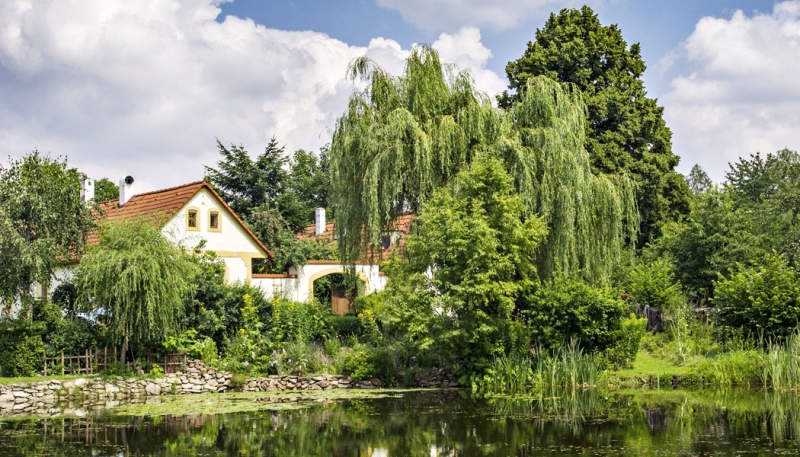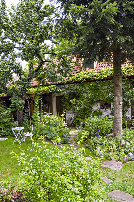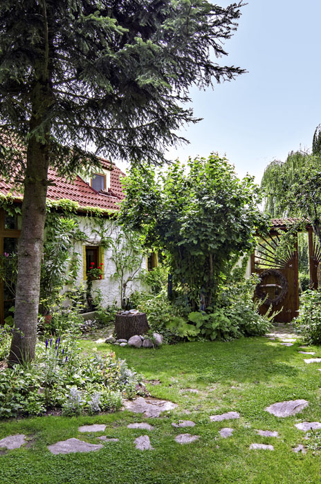Stačí přejít příjezdovou cestu a ocitnete se v další zahrádce, kterou stejně jako dvojici předzahrádek může obdivovat každý, kdo do Plavska zavítá. Chodidla tu pevně podpírá kamenné dláždění, zatímco nad hlavou povlávají jemné závoje smuteční vrby. Posaďte se k jejímu rozpraskanému kmenu, utopte oči v protějším trojúhelníkovém záhonu plném kyprejů, zavinutek, echinaceí, bělotrnů a vůbec všeho, co chutná motýlům a včelám, a už se vám nebude chtít nikdy odejít.