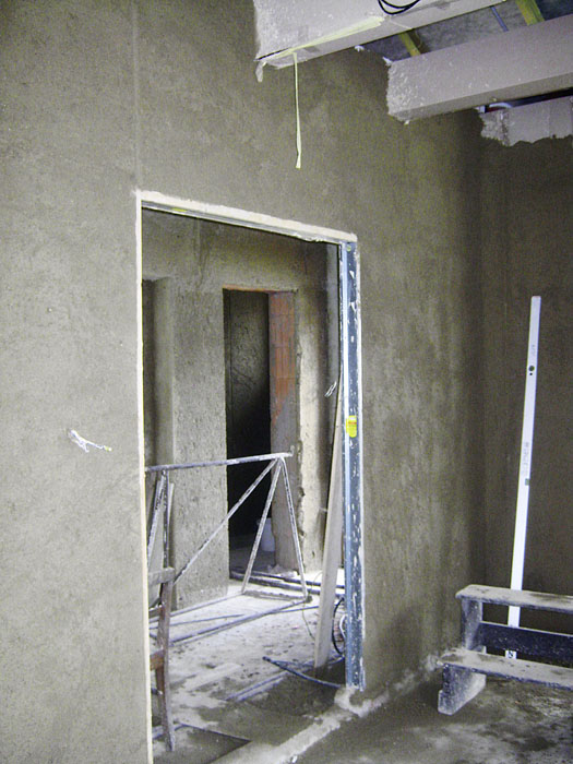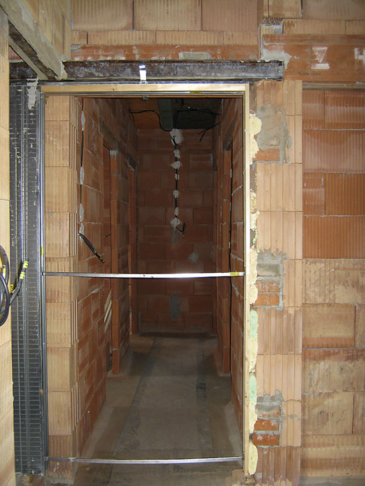 Než jsme mohli začít omítat stěny, musel manžel dodělat pár restů v domě. Dozdít kapsy kolem dřevěných trámů, opět obalit pohledové trámy proti zašpinění, osadit stavební pouzdra pro posuvné dveře, dodělat překlad nad jedním pouzdrem a dozdít i řady cihel nad překladem v hlavním obývacím prostoru, kde jsme se rozhodli pro další změnu oproti projektu: místo dveří tradičních jsme zvolili dveře posuvné do pouzdra.