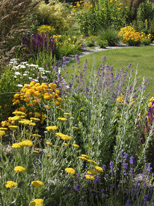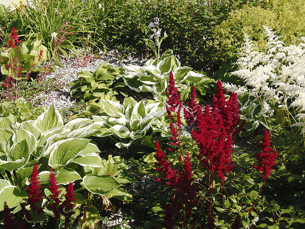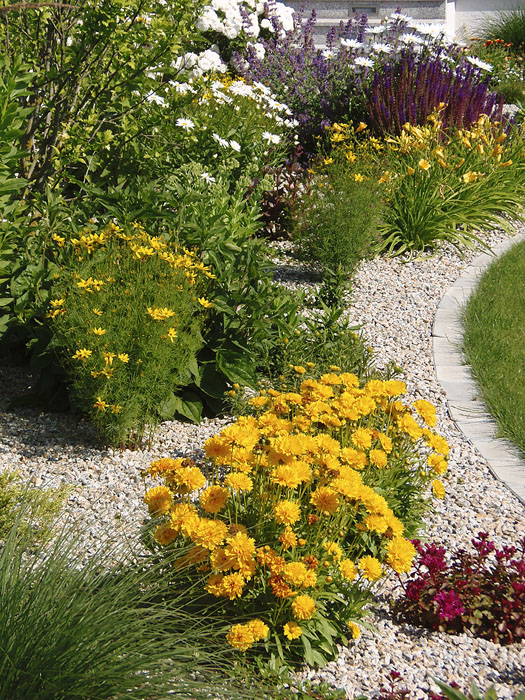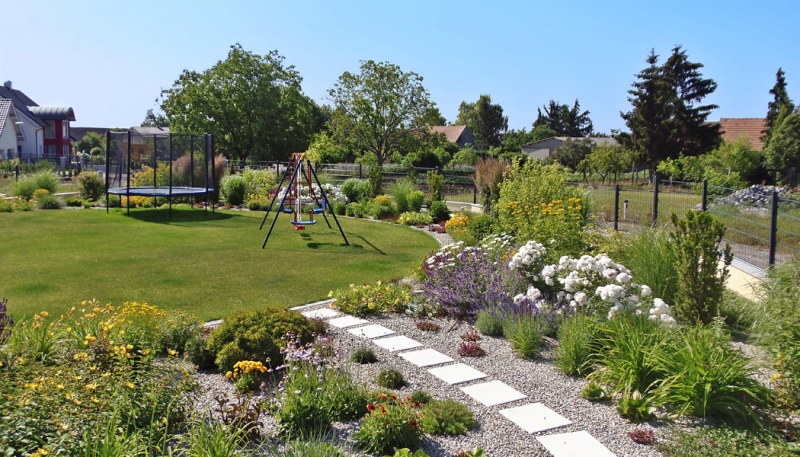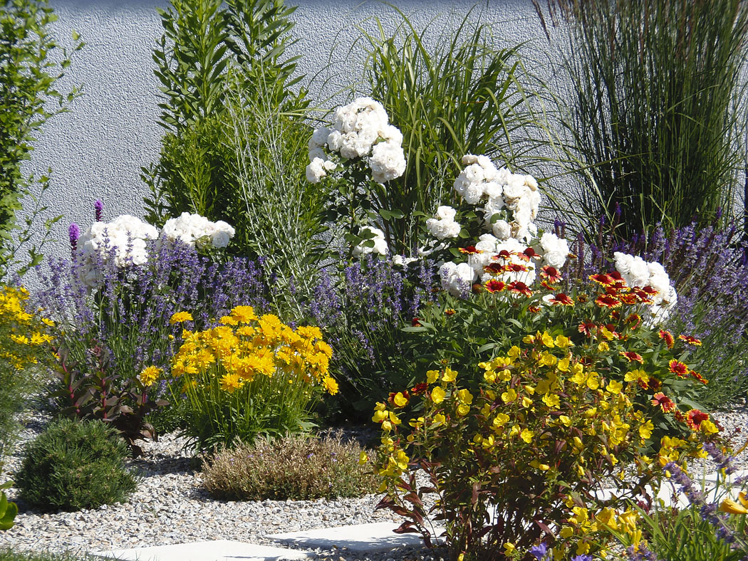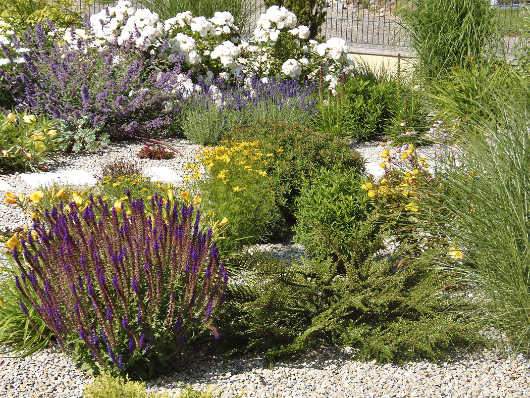 Samotná zahrada je plně osluněna, vysazeny jsou zde proto slunomilné rostliny, méně náročné trvalky a keře. Vpravo od terasy je vytvořena pohledová clona ze stálezelené kaliny, kaliny vonné, zlatice, tavolníku van Houtteova, vonného pustorylu a šeříku. Na záhonech obklopujících kruhový trávník rozkvétají levandule, bílé růže, kokardy, krásnoočka, šalvěje a rozchodníky.