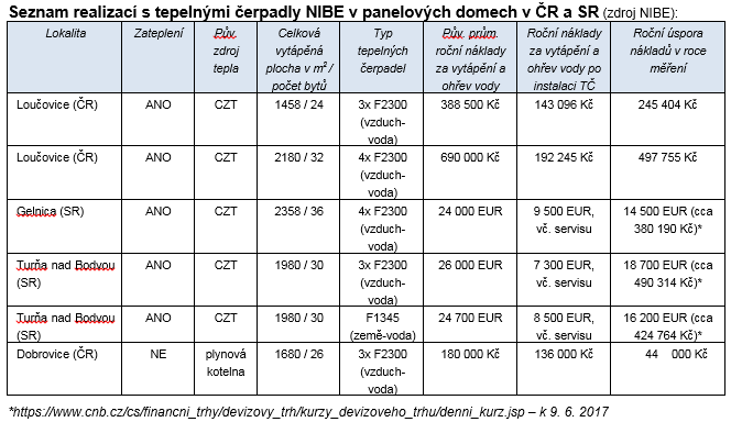 „Tepelná čerpadla NIBE zajišťují při odborné instalaci a funkčním zapojení do topného systému výraznou úsporu energií nejen v rodinných domech, ale také v komerčních nemovitostech, školách a bytových domech. Pokud má daný objekt vysoké tepelné ztráty, dá se jejich celkový výkon zvýšit propojením do kaskády. K tomuto řešení jsme přistoupili při instalaci tepelného čerpadla systému vzduch-voda NIBE F2300 v několika bytových domech v České republice i na Slovensku – v Dobrovici, Loučovicích, Turně nebo v Gelnici. Nový systém zde slouží k úspornému a ekologicky šetrnému vytápění a ohřevu vody,“ vysvětluje Jiří Sedláček, ředitel prodeje NIBE Energy Systems CZ, divize skupiny NIBE, a dodává: „U všech realizací jsme nechali provést kontrolní měření, abychom měli spolehlivě zdokumentované srovnání výše nákladů při napojení na CZT a po změně zdroje vytápění za tepelné čerpadlo.„