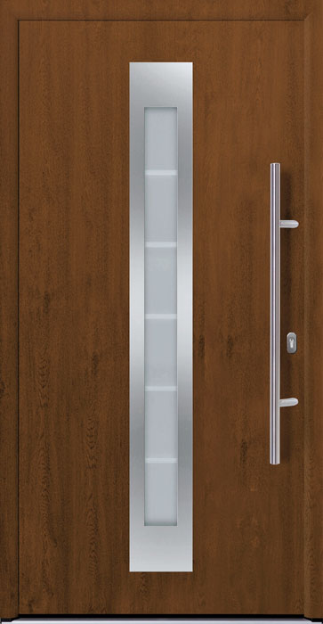 Moderní dřevodekor se dá kombinovat s hliníkovými páskami, různou velikostí, barvou prosklení i typem klik.