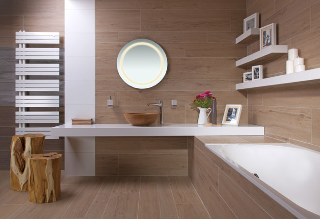 Dřevo, přírodní materiály a nekonečné množství jejich (více než precizních) imitací nepřestává fascinovat. A vždy v koupelně vytvoří nádech wellness stylu a na vás dýchne pohoda a útulnost. Příjemná atmosféra. Místo pro zasloužený relax po náročném dni. Nechte vyniknout absolutně dokonalému dřevěnému povrchu, přírodní kresbě dřeva i jeho nostalgické patině. Kombinujte jej s čistou jednoduchou linií zařizovacích předmětů, nejlépe v bílé barvě.