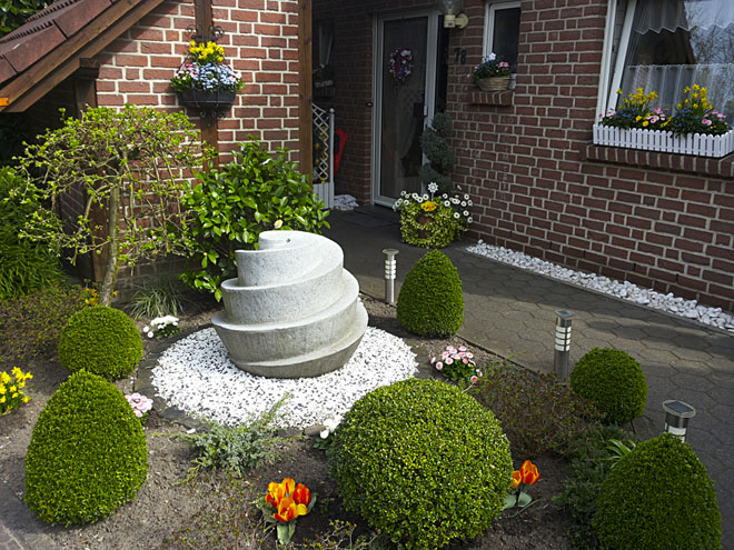 3. Geometrická předzahrádka: Kamenná socha ve tvaru šroubovice je v tomto případě centrálním objektem zahradnické kreace, navíc vhodně doplněné „opracovanými“ keři.