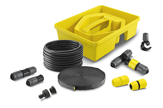 Rozšiřitelná zavlažovací sada Kärcher Rain v boxu s filtrem, manžetami pro kapénkovou závlahu, připojovacími díly a hadicemi je ideální startovací sadou pro efektivní zahradní zavlažování (KÄRCHER, www.karcher.cz).