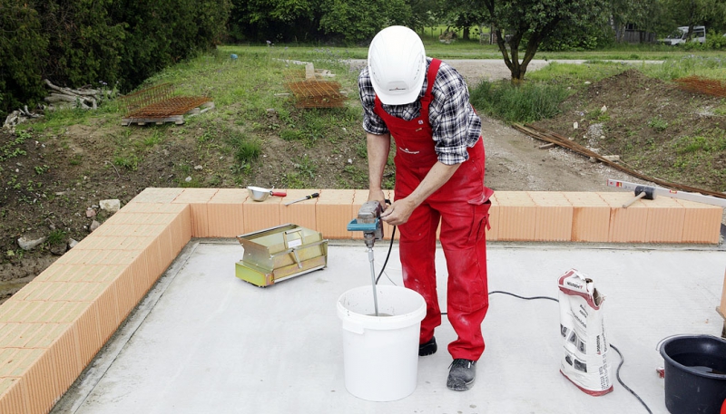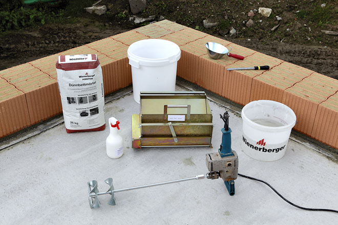 1. Potřebný materiál (podle programu produktů Wienerberger): tenkovrstvá malta, čisticí sprej (separační prostředek), vědro pro rozmíchání, maltovací vozík, vědro na vodu, mísidlo, fanka a pilník.