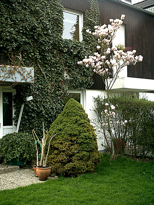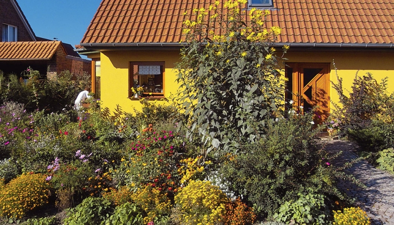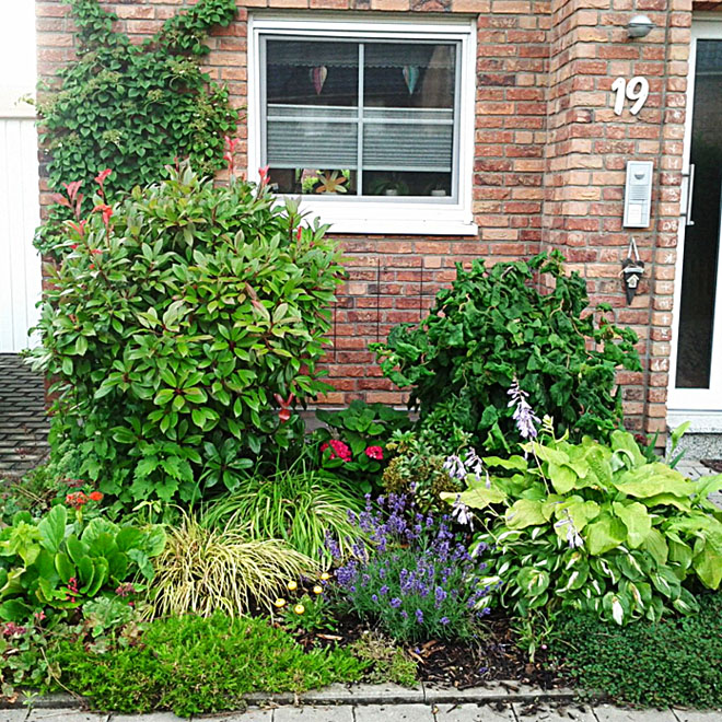 2. Bez plotu: Hranice pozemku je v tomto případě vymezena pouze mírně zvýšeným „štěrkovým“ záhonem. Zeleň je zde sice v menšině, ale vkusnou kompozicí předzahrádky a vzornou péčí o rostliny se podařilo vytvořit velmi příjemné zákoutí.