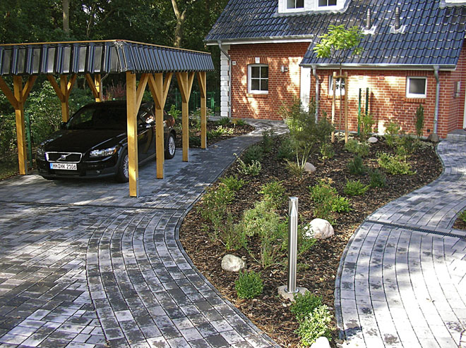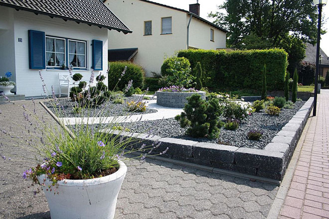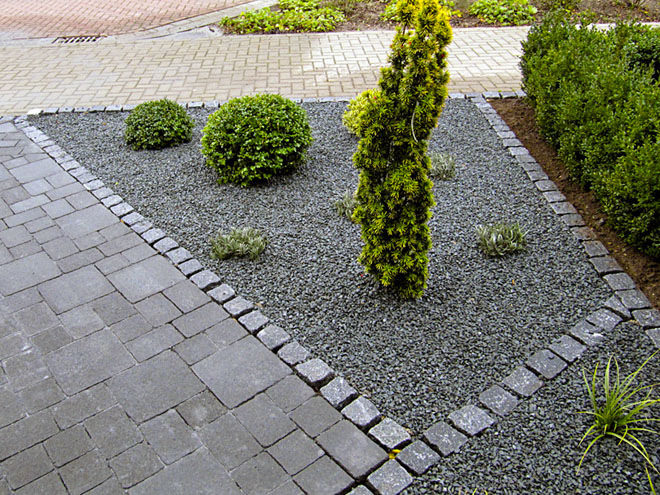 11. Tři odstíny šedi: Chodník ohraničuje štěrkové pole s několika keři. Toto řešení má výhodu: není nutné pravidelně sekat trávník a na údržbu postačí nůžky a hrábě.