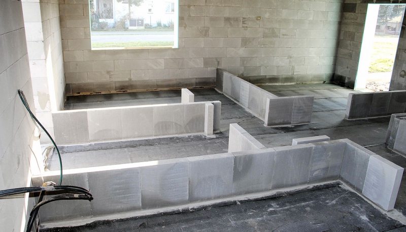 Betonová deska není v místnostech vylita celoplošně. V místech tomu určených v projektové dokumentaci jsme vytvořili „kanály“, kterými budou do místností přivedeny rozvody topení a elektřiny.
