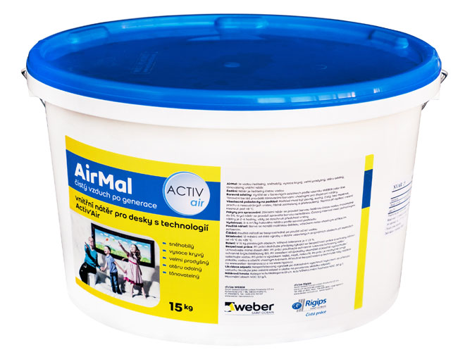 ,,K deskám s technologií Activ’Air® začala společnost Rigips prodávat prodyšný, tónovatelný nátěr pro interiéry – AirMal, který zabezpečí dokonalou a dlouhotrvající funkčnost desek s Activ’Air®“, doplňuje Ing. Martin Sochor, marketingový ředitel společnosti Rigips.