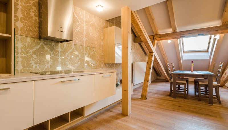 Podstřešní prostor členěný dřevěnými prvky nabízí útulné a zároveň moderní bydlení. Původní trámy i nadále plní nosnou funkci. V místech, kde nebylo pro nevyhovující stav možno zachovat původní dřevo, se použilo nové, jehož vzhled byl vizuálně přizpůsoben původnímu.