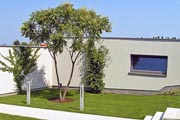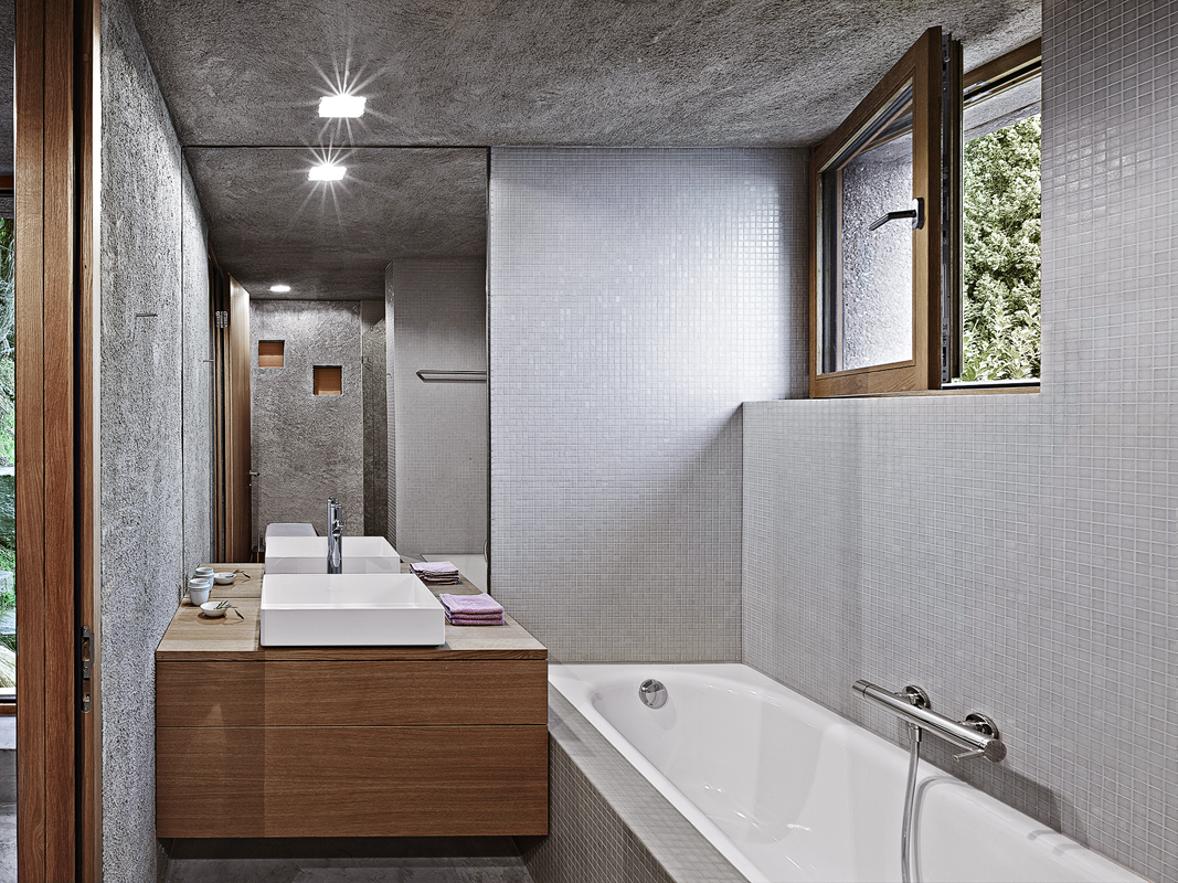 Architekt o projektu říká: „Hledali jsme materiály, které by korespondovaly s okolím a tradičními stavbami z kamene. Proto jsme použili speciálně ošetřený vymývaný beton, v němž se právě díky použité technologii znovuobjeví drsná struktura kamene. Dům bude stárnutím získávat příjemnou patinu.“