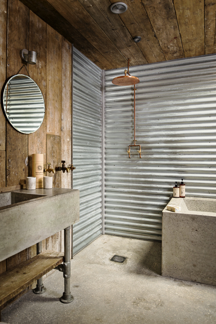 Z ložnice je přístup do koupelny, která je postavená ze dřeva a vlnitého plechu. Krásné detaily jako plechová nádrž, měděná sprcha, mosazné kohoutky a v neposlední řadě i průhledy na modré nebe jsou důležitými estetickými prvky.