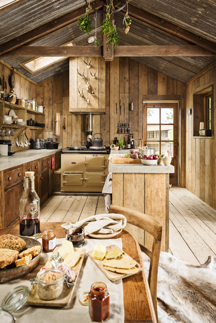 Luxusem je tu právě krása prostého života. Srub nabízí možnost vlastního vaření, relaxaci u krbu na měkké sametové pohovce i posezení na terase, kde je další otevřené ohniště. Plně vybavená kuchyň, včetně nenápadně začleněných moderních přístrojů, poskytuje veškerý komfort. Pocit bezprostředního kontaktu s okolím umocňují velké dveře mezi terasou a kuchyní.