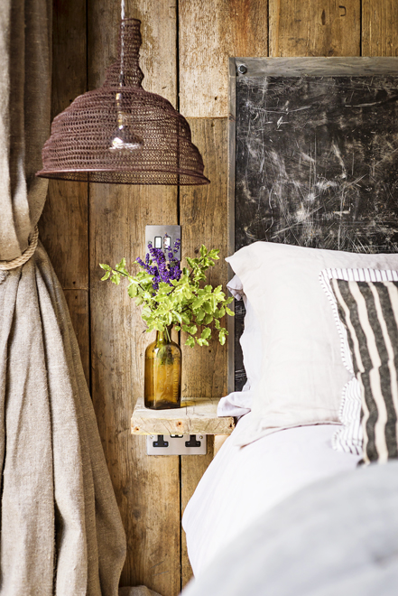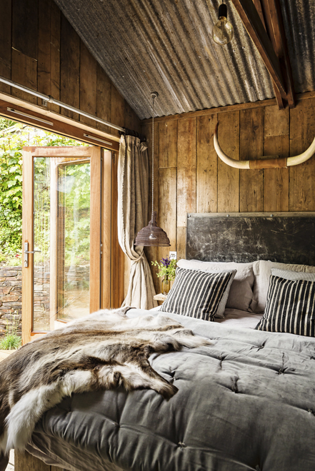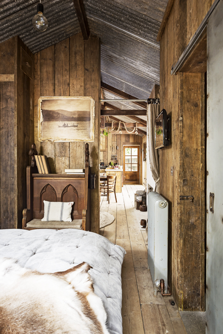 Poodrhneme-li nenápadný jutový závěs v rohu kuchyně, vstoupíme do pohodlné ložnice, která má syrový charakter dřevorubeckého pokoje. Velká manželská postel se lněným povlečením a sametovým přehozem láká k odpočinku.