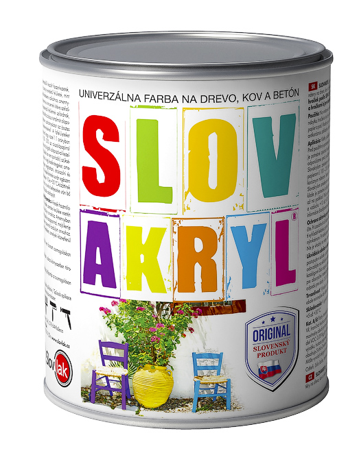 Slovakryl je univerzální vodou ředitelná barva na dřevo, kov a beton, vhodná pro domácí užití, výrobu různých dekorací, ale i pro profesionály. Kromě kamene, dřeva, kovu a betonu ji využijete i na nátěry omítek, dřevotřísky, papíru a kartonu. Je vhodná i na dětský nábytek a hračky. Vyrábí Slovlak v široké barevné škále 30 odstínů.