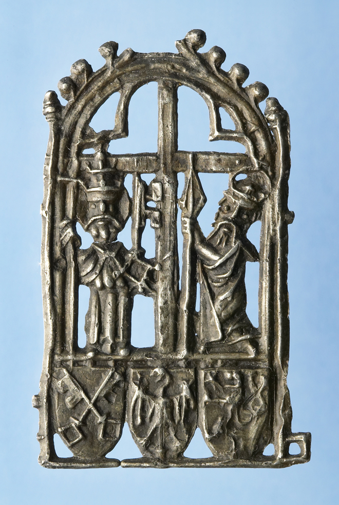 Kromě modelů návštěvníci expozice uvidí i řadu cenných exponátů ze sbírek muzea jako například poutní odznak z druhé poloviny 14. století dokládající, že Praha v době Karla IV. patřila k významným poutním místům.
