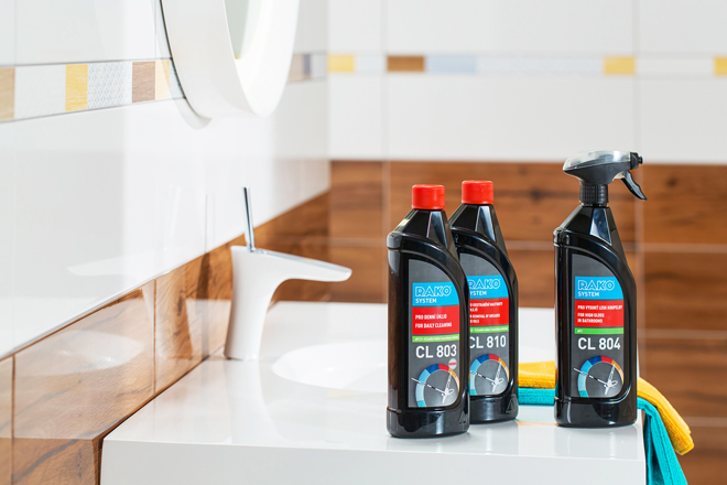 Čistotu, ale také exkluzivní vzhled, dodají koupelně přípravky s obsahem lesku, který zpomaluje znečištění povrchu a dlouhodobě zlepšuje vzhled leštěných a chromovaných povrchů. Najdete jej také v nabídce RAKO SYSTEM, pod názvem RAKO CL 804.