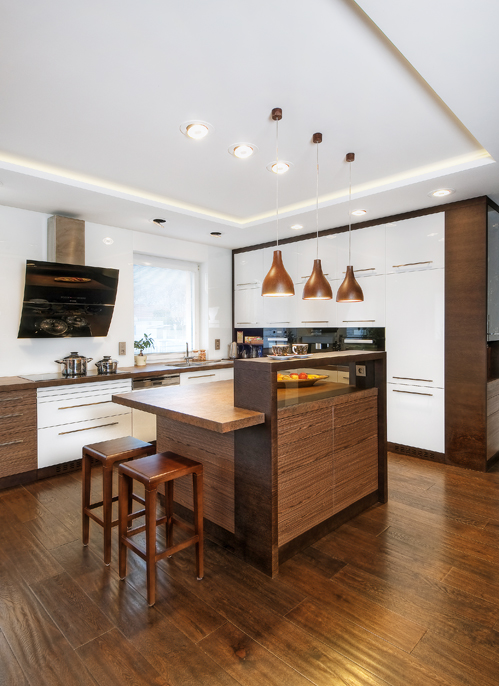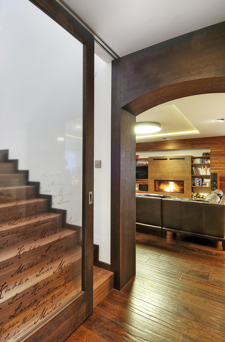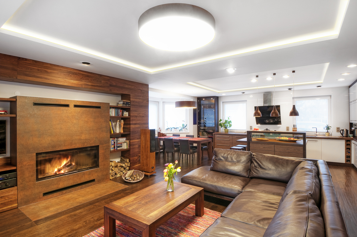 Přízemní denní prostor zůstal multifunkční, najdete tu obývací pokoj, kuchyň a jídelnu. Pomocí nového velkorozměrného okna směrem do zahrady se ho podařilo prosvětlit a propojit se zelení. Zmizela i zmiňovaná příčka a zazdilo se malé okno na místě, kde je dnes krb. Tyto práce probíhaly v režii majitele domu, který vlastní stavební firmu. Pro zdárnou změnu vzhledu interiéru byla podstatná výměna celého vnitřního vybavení včetně podlah, stropu, elektroinstalace a nábytku.